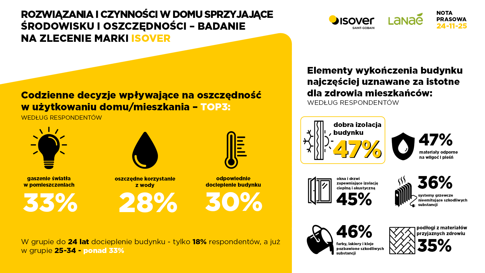 Przeprowadzone badanie pokazuje też jak codzienne, małe decyzje dotyczące użytkowania budynku, mogą wpływać realnie na nasze oszczędności. W odpowiedziach respondenci najczęściej wskazywali na trzy kluczowe aspekty: gaszenie światła (33%), odpowiednie docieplenie budynku (30%) oraz oszczędne korzystanie z wody (28%). Przy czym w grupie 25-34 lat (czyli tej, która potencjalnie staje właśnie przed decyzją czy kupić mieszkanie lub budować dom) odpowiednie docieplenie budynku wskazało ponad 33% respondentów i jest to najwyższy wynik ze wszystkich grup wiekowych. Pokazuje to rosnącą świadomość pro ekologicznych postaw wśród młodego pokolenia. Młodzi ludzie widzą, że nie tylko codzienne drobne gesty, ale także to z czego składa się nasz dom, może służyć oszczędnościom oraz naszemu zdrowiu. Być może w dłuższej perspektywie daje to szansę na zmiany, które niosłyby ze sobą poprawę jakości powietrza w Polsce oraz rzeczywiste oszczędności dla rodzin. Co ciekawe aż 47% badanych podkreślało w swoich odpowiedziach również rolę dobrej izolacji budynku jako ważną także dla zdrowia jego mieszkańców.