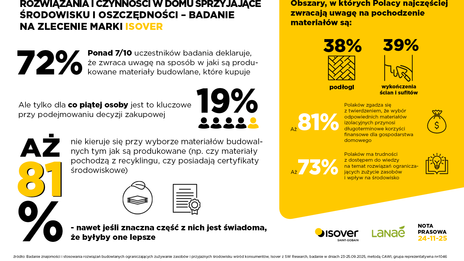 [1] ISOVER, SW RESEARCH, Badanie znajomości i stosowania rozwiązań budowlanych ograniczających zużycie zasobów i przyjaznych środowisku, przeprowadzone 23-25.09.2025, grupa reprezentatywna n = 1046, metodą CAWI
